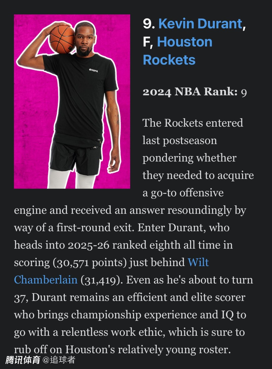 ESPN公布新赛季百大球星排名,杜兰特排在第9位;排在前十的球星还有——1、约基奇;2、亚历山大;3、东契奇;4、阿德托昆博;5、文班亚马;6、爱德华兹;7、库里;8、詹姆斯和10、布伦森。