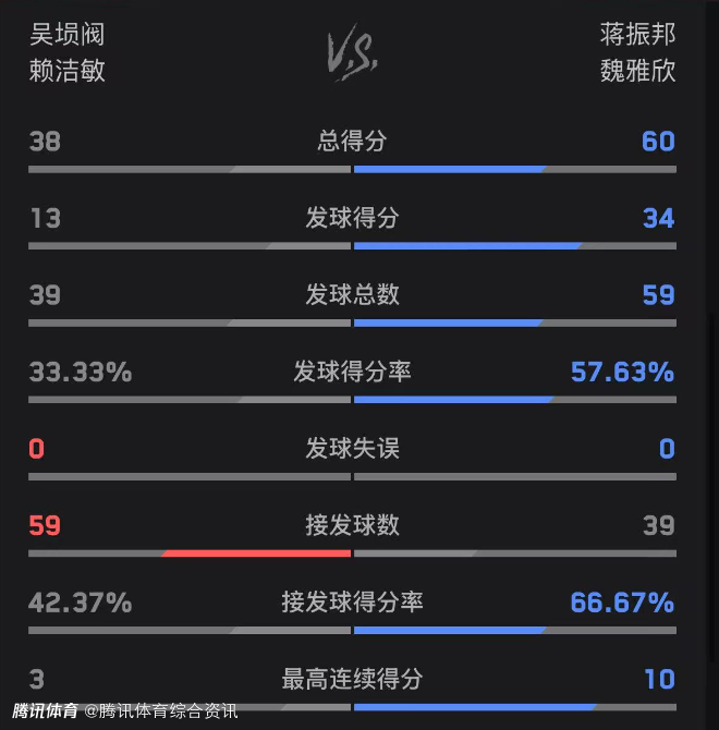 双方技术统计如下(丫邦组合在前):总得分60-38、发球得分34-13、发球得分率57.63%-33.33%。
