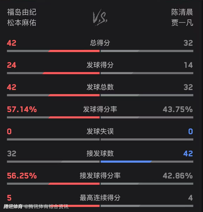 双方技术统计如下(凡晨组合在前):总得分32-42、发球得分14-24、发球得分率43.75%-57.14%。