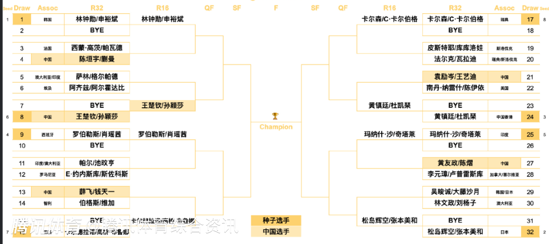 WTT中国大满贯混双签表:王楚钦/孙颖莎首轮轮空 陈垣宇/蒯曼战法国组合