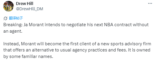 据悉,莫兰特计划在谈判其下一份NBA合同时不聘请经纪人。相反,莫兰特将成为一家新型体育咨询公司的首位客户。该公司提供有别于传统经纪公司的服务模式及收费标准,其创始人中不乏一些业内熟知的人物。