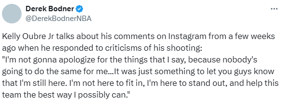 乌布雷说道:“我不会为自己说过的话道歉,因为换作别人,没人会为我这样做。我只是想让所有人知道,我还在这里。我不是来球队凑数的,我是带着目标来的,要在这里打出点成绩,尽自己所能帮助球队赢球。”