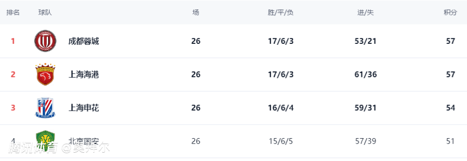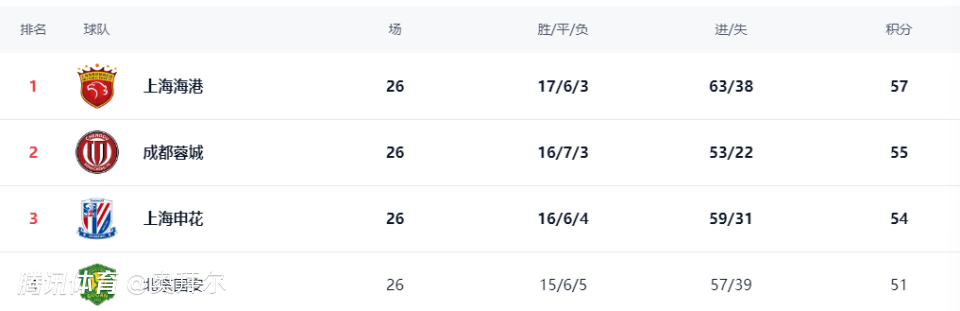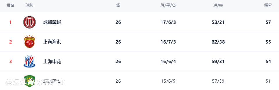 最终,海港在26轮之后以57分排名榜首,成都蓉城以55分排名次席,申花、国安分别排名第3、4位。