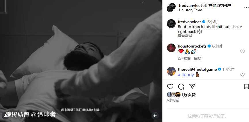 范弗利特重伤手术仍坚信火箭能夺得NBA总冠军;在他的动态下,火箭官方回复“火箭起飞”的表情;杜兰特、保罗、申京、塔图姆、比尔、洛瑞等球星都点赞为范弗利特送祝福。
