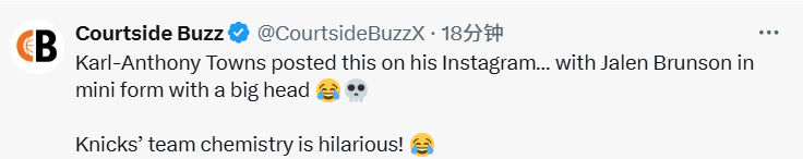 2025-09-27 09:20北京时间9月27日,尼克斯队球员唐斯更新个人社交媒体,晒出了一张自己与队友阿奴诺比和布伦森的合照,有趣的是,布伦森在图中是“迷你版”造型,脑袋却很大。