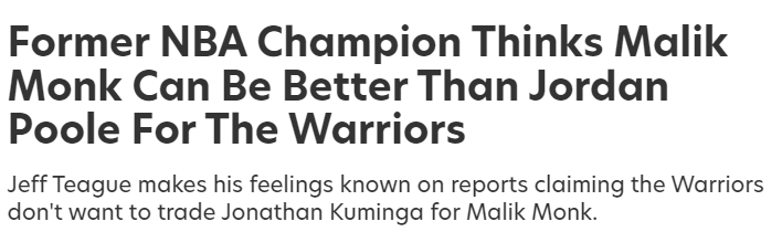 在谈判遇阻的消息传出后,前NBA总冠军成员杰夫-蒂格在其播客节目中,就勇士队据称不愿接纳蒙克合同以换取库明加的态度发表了看法。
