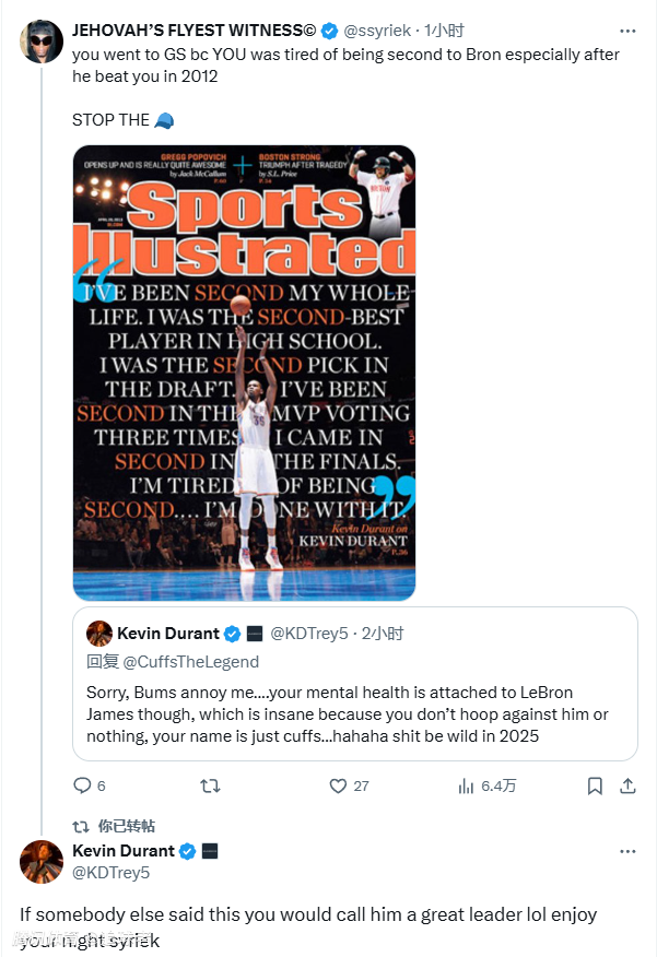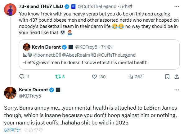 杜兰特回复:抱歉,但那些废物真让我很烦……不过你自己的精神健康跟勒布朗-詹姆斯有关,这简直太疯狂了,你根本没跟他打过篮球,在他那儿你也就是个“无名鼠辈”,哈哈,2025年太疯狂了。