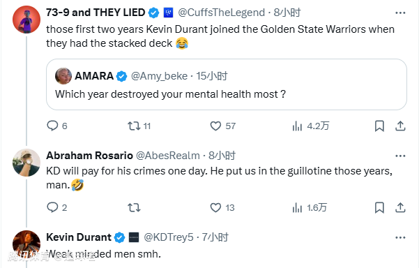 CuffsTheLegend回复道:凯文-杜兰特加入金州勇士队的头两年,当时勇士队实力雄厚;另一球迷则表示:KD总有一天会为他的罪行付出代价的,那些年他把我们送上了断头台。
