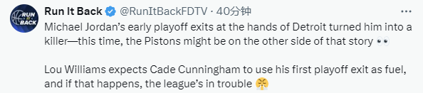 “这也是坎宁安能做到的事情,他会从他的首次季后赛经历中吸取经验,就像乔丹当年从输给活塞队的经历中学习一样。”