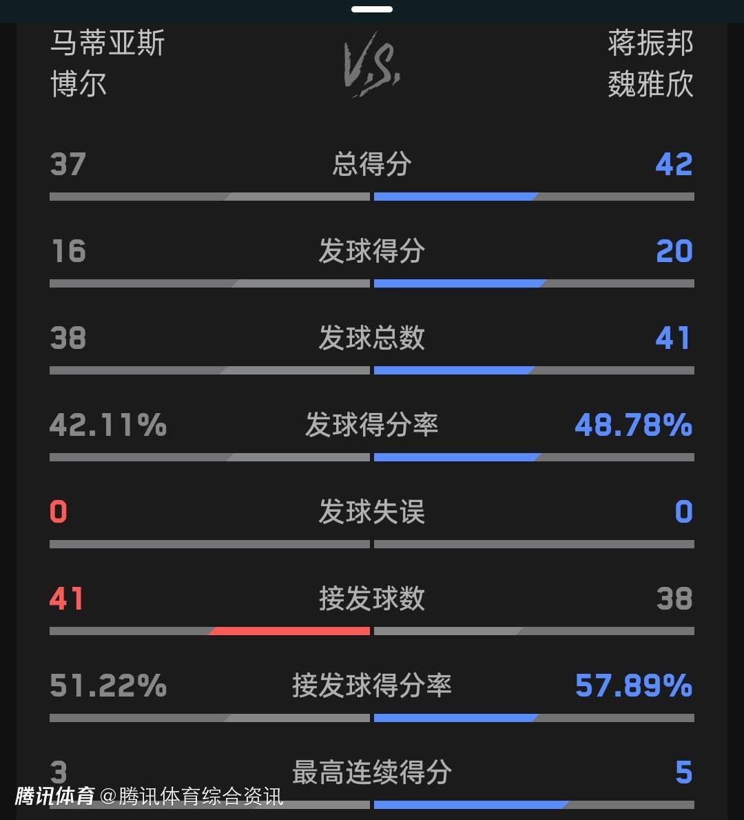 双方技术统计如下(蒋振邦/魏雅欣在后):总得分37-42、发球得分16-20、发球得分率42.11%-48.78%