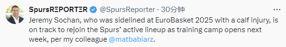 2025-09-27 19:50北京时间9月27日,索汉接受马刺队记者Mateusz Babiarz采访,期间他透露自己将在训练营开启时完全康复。