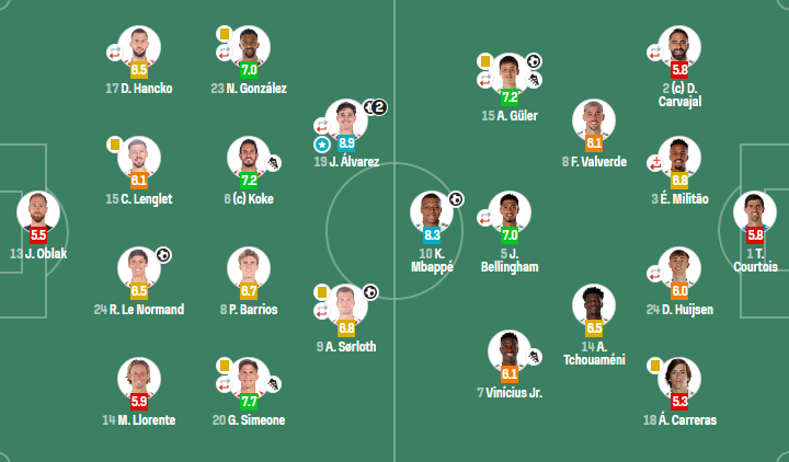 马德里竞技(4-4-2):奥布拉克;马科斯-略伦特,勒诺尔芒,朗格莱,汉茨科(83'加兰);小西蒙尼(91'莫利纳),巴里奥斯,科克,尼科-冈萨雷斯(83'格列兹曼);索尔洛特(67'加拉格尔),阿尔瓦雷斯(91'巴埃纳)