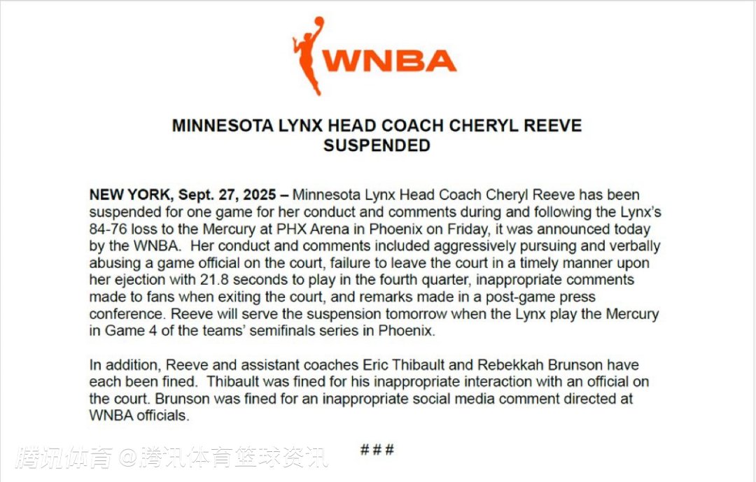 2025-09-28 06:10北京时间9月28日,WNBA官方发布公告,宣布明尼苏达山猫队主教练谢丽尔-丽芙因在球队以84-76不敌水星队的比赛期间及赛后的行为与言论,被处以禁赛一场的处罚。