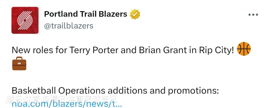 两旧将回归!开拓者官宣人事变动:格兰特任联络员 波特开启球探生涯