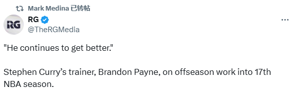 2025-09-28 11:00北京时间9月28日,库里的训练师Brandon Payne接受勇士记者Mark Medina的采访,期间Payne透露37岁的库里更强壮了且速度没有下降,弹跳变得更好,还直言库里不会因为任何原因放弃投篮的机会。