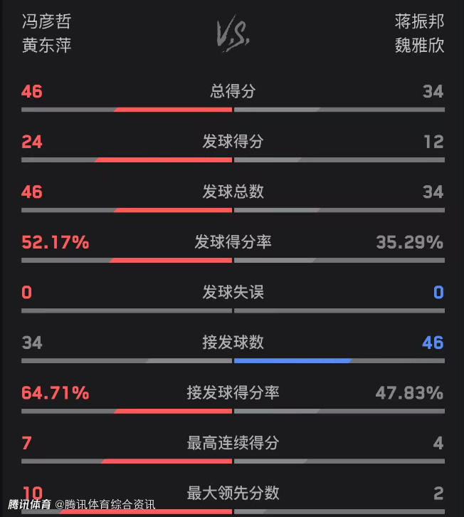 双方技术统计如下(凤凰组合在前):总得分46-34、发球得分24-12、发球得分率52.17%-35.29%