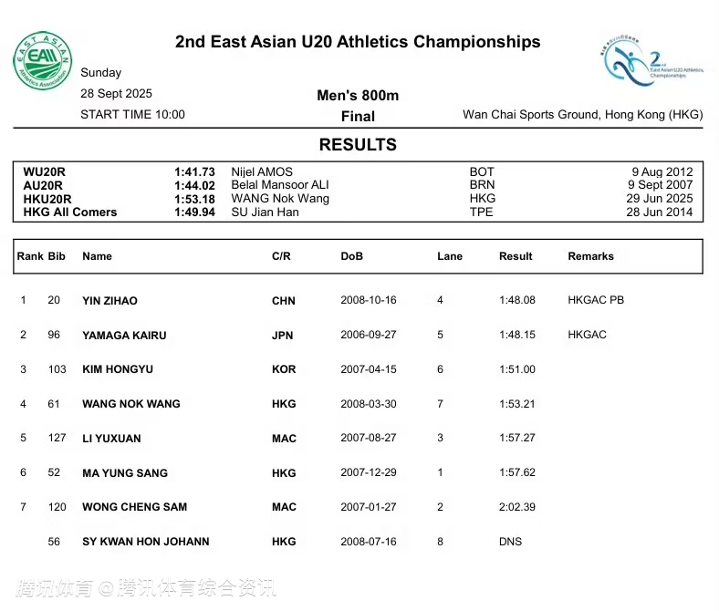 2025-09-28 12:20北京时间9月28日,在中国香港进行的第二届东亚U20田径锦标赛结束了男子800米决赛争夺,还不到17周岁的中国选手尹子豪,在最后时刻追上日本选手山鹿快琉,以1分48秒08的成绩获得冠军,创造中国香港本土赛事纪录。