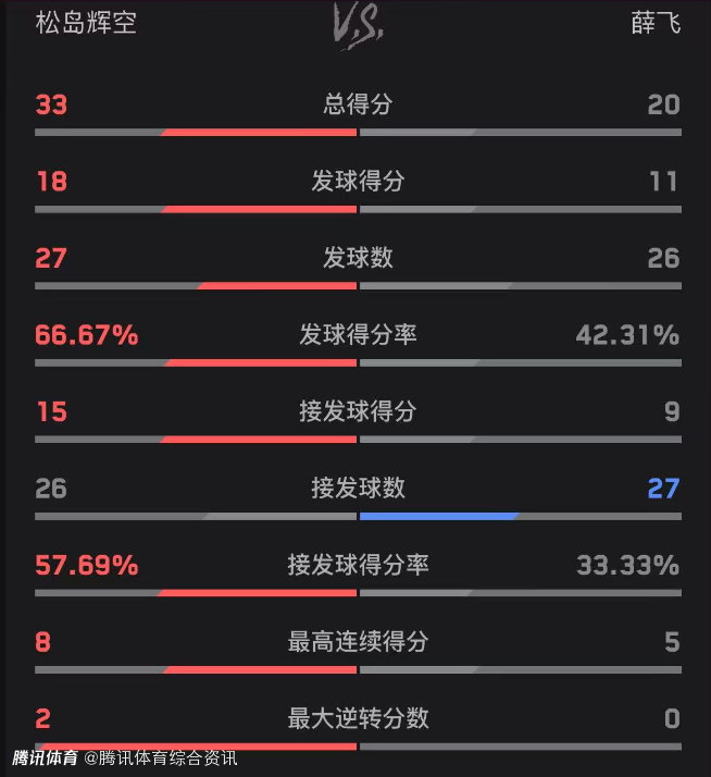 双方技术统计如下(薛飞在前):总得分20-33、发球得分11-18、发球得分率42.31%-66.67%。
