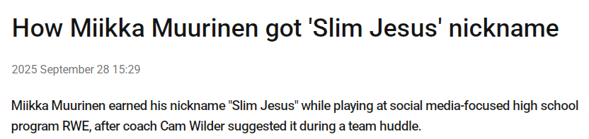 穆里宁在接受采访时表示:“去年春天,我在Cam Wilder的RWE队打球。一次训练后,他在投半场球,之后我们聚在一起,他和球员们聊天时突然说:‘我们是不是该叫这小子‘瘦耶稣’?昵称差不多就是这么来的。” 。