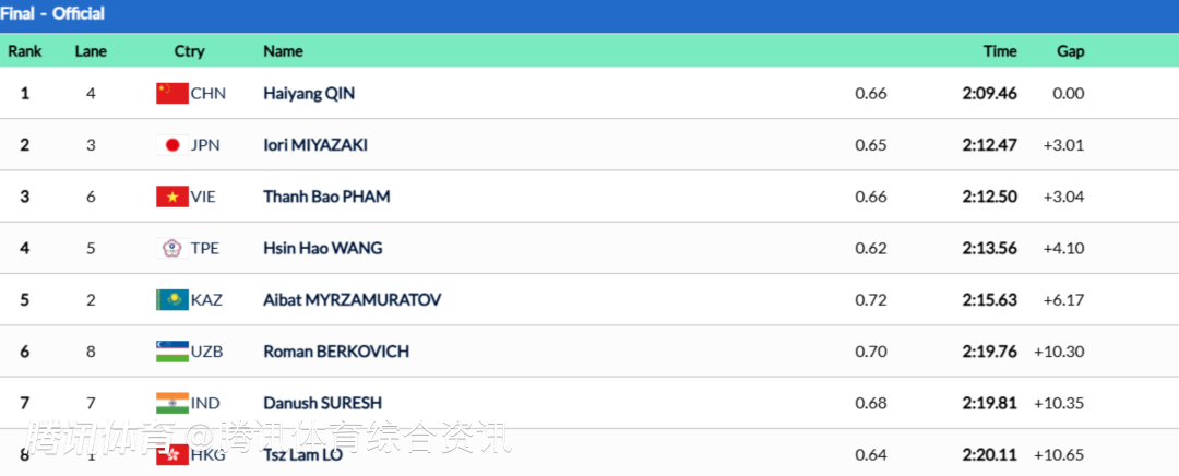 此前的预赛,覃海洋以2分13秒86,总排名第一晋级决赛。决赛中,覃海洋的状态更加火热,保持着绝对的领先,最终以2分05秒48的成绩创亚洲纪录,成功夺金。