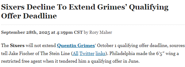 76人队记Gina Mizell最先报道,格雷姆斯的经纪人戴维-鲍曼已请求76人队延长资质报价截止日期,该操作需球员与球队双方同意。Fischer于证实了这一消息,并明确表示鲍曼希望将截止日期延后一周,至10月8日。