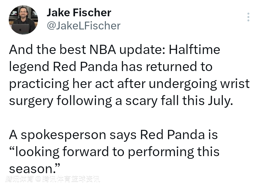 2025-09-29 06:30北京时间9月29日,据名记Jake Fischer报道,NBA中场表演传奇人物 “红熊猫”(Red Panda)在今年7月遭遇惊险摔倒并接受手腕手术后,现已重返训练场,恢复其标志性表演的训练。