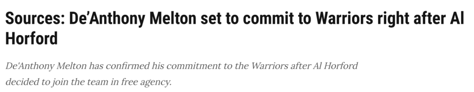 在霍福德正式承诺加盟勇士的消息传出后不久,联盟消息人士透露,自由球员梅尔顿也已确定将加盟勇士队。