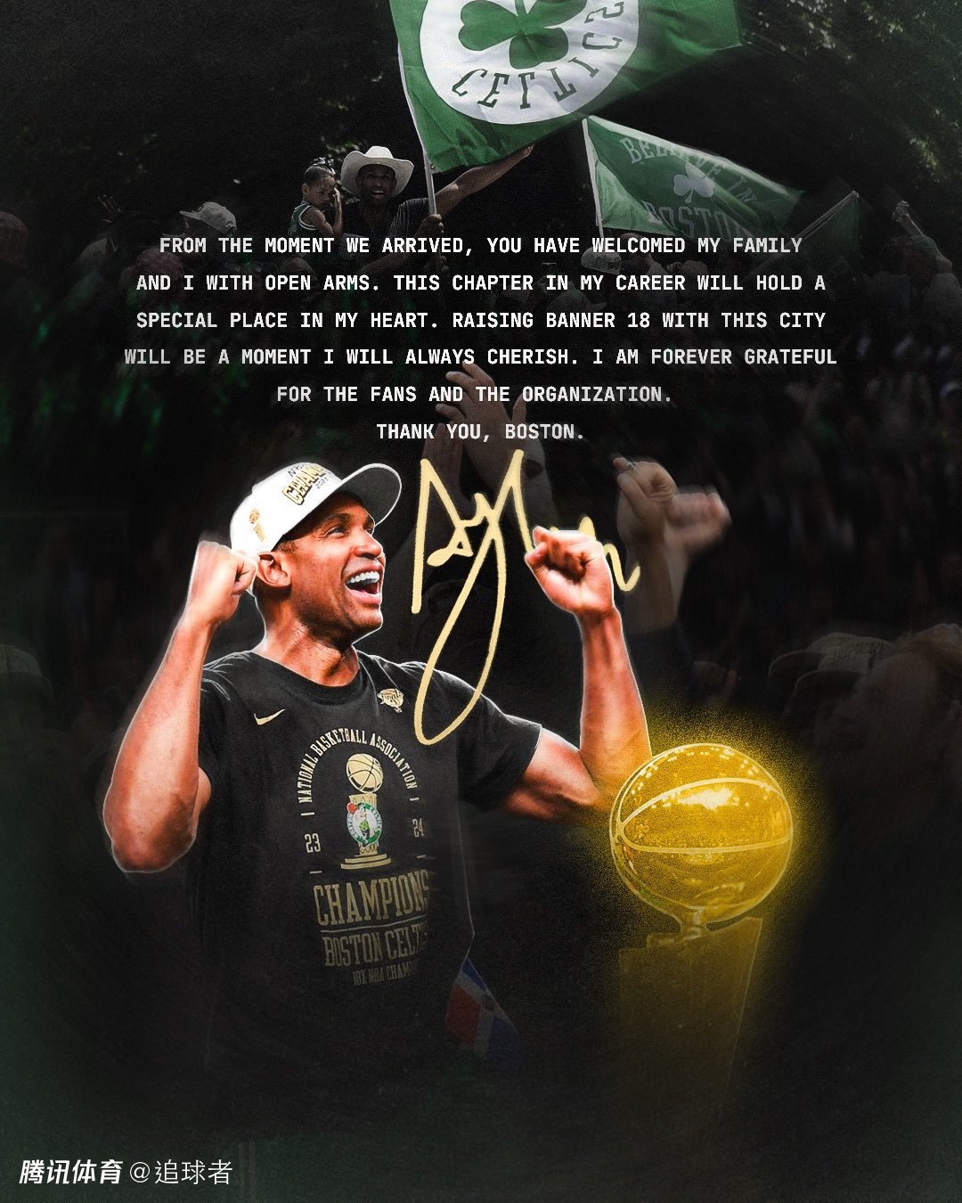 虽然合同还未正式签约,但霍福德加盟勇士只差官宣;霍福德更是深情发声告别凯尔特人,晒出帮助凯尔特人夺得第18冠的海报,配文写道:自我们抵达之日起,你们就以无比的热情欢迎了我和我的家人们。这段职业生涯的经历将永远在我心中占据一个特殊的位置。与这座城市一起升起第18面总冠军旗帜将是我此生永远铭记的一刻。我将永远感激球队和球迷们,谢谢你们,波士顿。