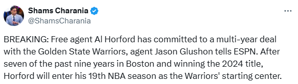 shams补充报道,在7月自由市场开启时,39岁的霍福德就始终是勇士队的头号中锋引援目标,当时霍福德正在考虑是加盟金州勇士还是退役;此后,霍福德成为众多等待库明加决定的自由球员之一,如今,他率先做出决定,承诺与勇士签下多年合约。