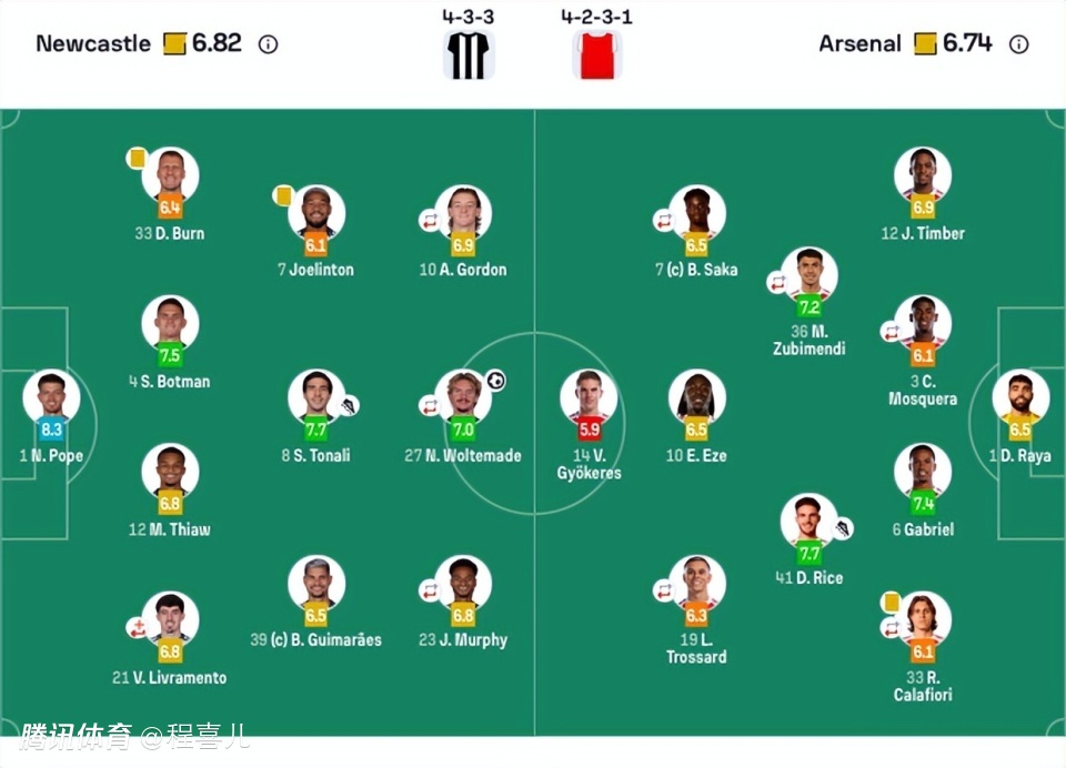 纽卡斯尔首发:1-波普、4-博特曼、12-佳夫、21-利夫拉门托(76’6-拉塞尔斯)、33-丹·伯恩、7-乔林顿(94’11-巴恩斯)、8-托纳利、39-吉马良斯、10-戈登(66’20-伊兰加)、23-雅各布·墨菲(66’2-特里皮尔)、27-沃尔特马德(66’18-奥苏拉)。