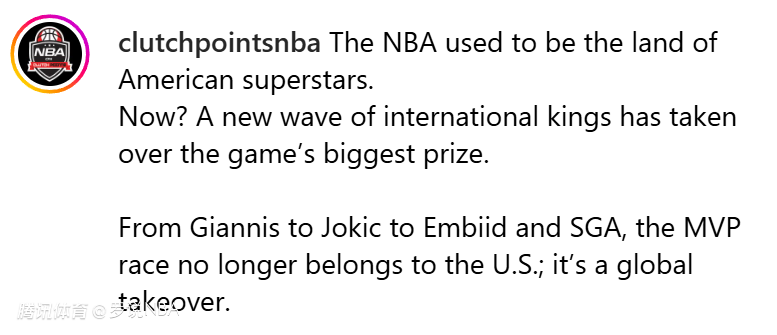 这是NBA权力格局的真正转变 —— 篮球界的顶尖天才,不再仅来自某一个国家,而是源自全球各地。上一次美国球员斩获常规赛MVP奖项,已经要追溯到2018年的詹姆斯-哈登,此后7年,这一奖项都被国际球员把持。下一次美国球员当选常规赛MVP,要到什么时候呢?欢迎大家发表见解。