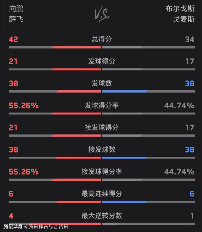 双方技术统计如下(薛飞/向鹏在前):总得分42-34、发球得分21-17、发球得分率55.26%-44.74%。
