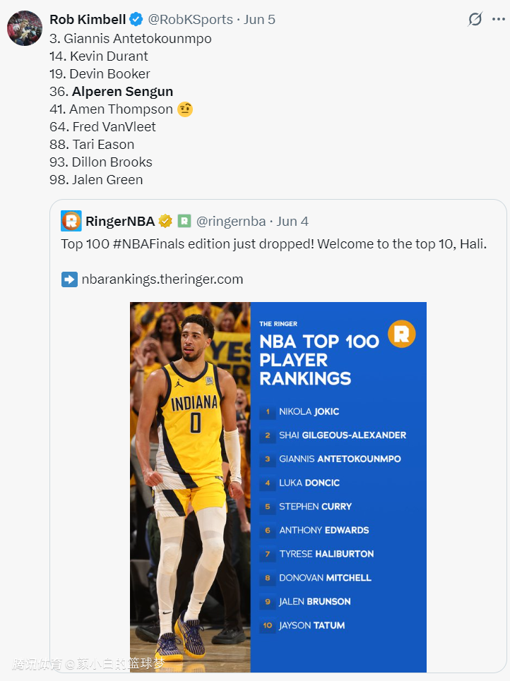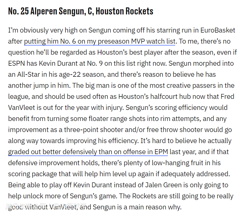 SB NATION写道:显然在申京打完欧洲杯后他对他的评价大幅提升,我甚至将他纳入新赛季初MVP前六。在我看来他在下赛季结束后毫无疑问是火箭最佳球员,即便是ESPN将杜兰特排在第九。