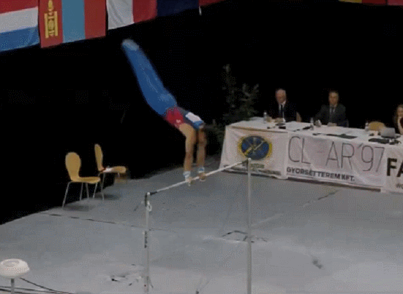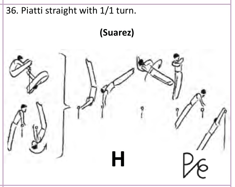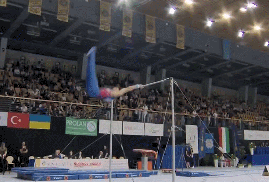 而且再握杠之后,他居然还有足够的动能,直接形成大回环,而不是因为动能不足,要重新采用反掏压上成倒立,这说明对皮里亚蒂360动作发力的完全掌握。