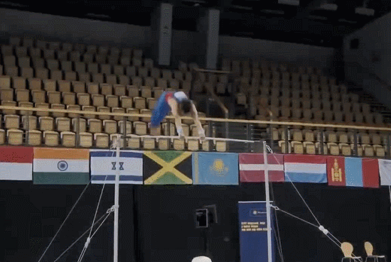 上到器械后,经过几个向前大回环的振浪发力,他一鼓作气完成了“中穿180+分腿正掏直体特卡切夫360”的D+H惊世连接!