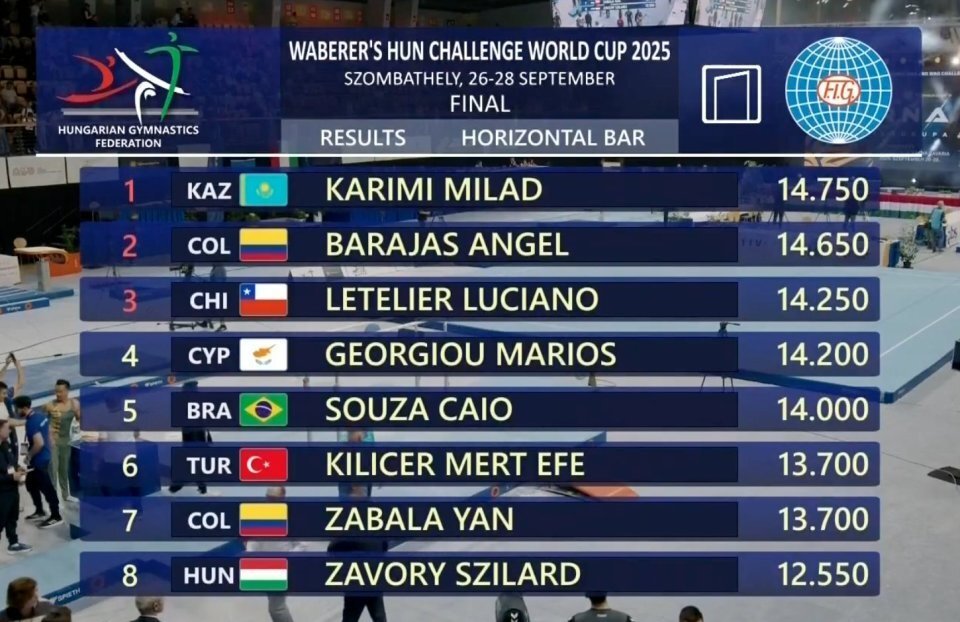 2025-09-29 16:00在匈牙利进行的2025体操世界杯挑战赛-松博特海伊男子单杠决赛里,来自哥伦比亚的选手巴拉加斯演绎了一套具有D+H独创连接的高难度套路,最终以14.65分收获银牌。