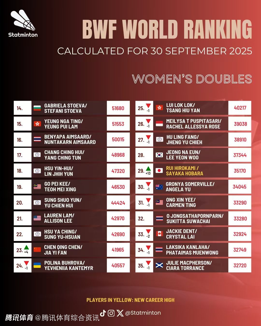 国羽四对组合排名稳定: