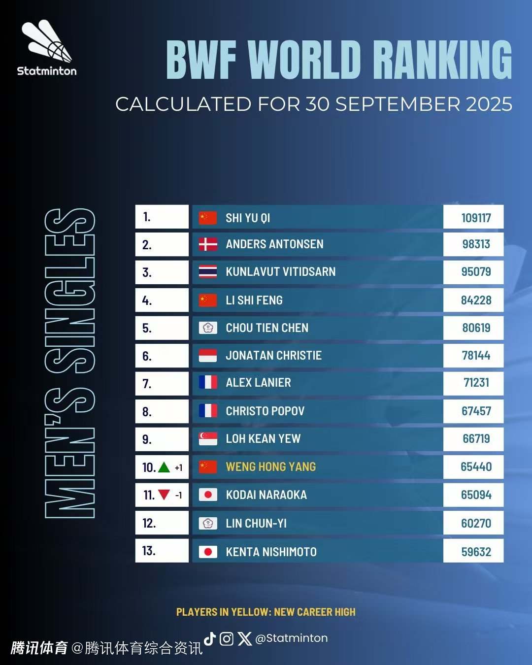 世界羽联第40周排名揭晓:石宇奇稳居男单第一 翁泓阳首度冲进前十