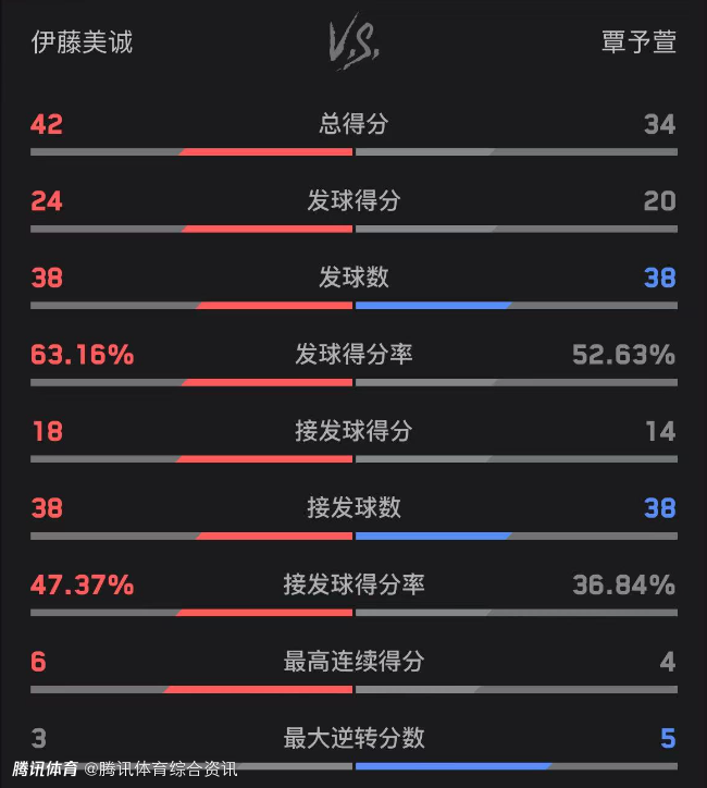 双方技术统计如下(覃予萱在前):总得分34-42、发球得分20-24、发球得分率52.63%-63.16%。