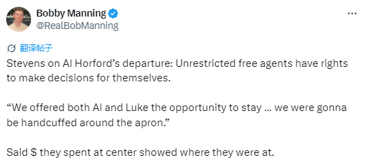 史蒂文斯谈霍福德离队:完全自由球员有权为自己做决定 迫于薪资空间导致操作受限
