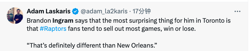 英格拉姆:无论输赢猛龙主场大多场次都会满座 很高兴来到球队为队友减压