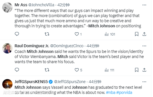 米奇-约翰逊表示,他希望马刺队的风格定位与愿景能围绕文班亚马展开。他提到,文班亚马是球队的最佳球员,希望全队能与他保持一致的专注度。