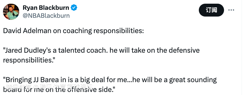 谈及球队新引进的两名助教巴里亚和杜德利,小阿德尔曼表示:“引进巴里亚对我来说意义重大,他会在进攻端成为我的重要参谋。杜德利是位有才华的教练,他将承担防守端的职责。”