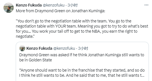 关于库明加,追梦还补充道:“球员谈判时,对象不是球队,而是你自己的团队。也就是说,你得努力为自己争取最优选择。你拼尽全力进入NBA,就理应拥有谈判的权利。”