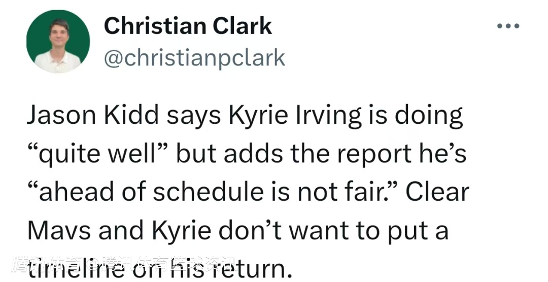 关于欧文的复出时间,基德否认了欧文将“提前复出”的流言,称这对球员不公平。他表示欧文的恢复进展顺利,但球队和球员本人都没有设定具体的复出时间表。
