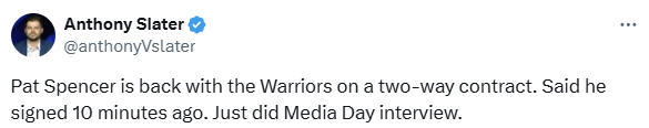 2025-09-30 08:50北京时间9月30日,根据勇士队记者Anthony Slater报道,帕特-斯宾塞与勇士队签下了一份双向合同。勇士队官方随后也发文,确认了斯宾塞的回归。