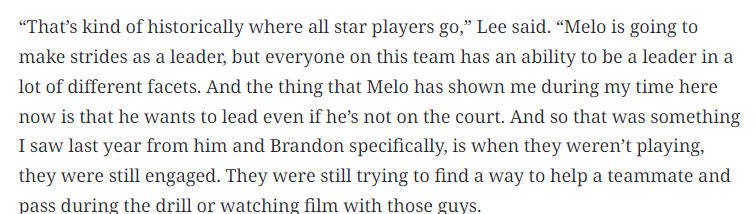 在谈到球队核心拉梅洛-鲍尔时,李表示:“鲍尔在休赛期变得更加愿意发声,这也是他休赛期训练的重点之一。他正一步步努力提升自己,更好地承担起领袖角色,从历史来看,所有全明星球员都会经历这样的成长阶段。他会在领导力方面不断进步,但队里的每一个人,都能在不同层面发挥领袖作用。而且在我执教这段时间里,鲍尔让我看到了一点:即便不在场上,他也想带领球队。其实上赛季我就注意到了,尤其是他和米勒哪怕不能上场,他们也会全身心投入,比如想办法帮队友,在训练中传球配合,或者和大家一起看录像分析。”