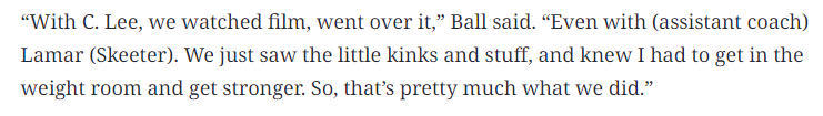 整个夏天,鲍尔几乎每天都会出现在黄蜂队位于皇后大学莱文中心的临时训练基地,他在休赛期强化了身体,通过增重提升力量。“我和查尔斯-李一起看比赛录像,分析问题,”鲍尔说,“助理教练拉马尔-斯基特也参与了。我们发现了一些细节上的不足,也清楚我必须进力量房,让自己更强壮。所以过去这段时间,我们基本就是这么做的。”