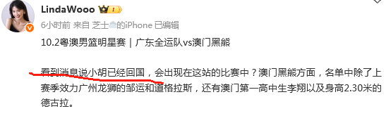 2025-09-30 17:00北京时间9月30日,根据媒体人LindaWooo的报道,看到消息说小胡已经回国,会出现在这站的比赛中。澳门黑熊方面,名单中除了上赛季效力广州龙狮的邹运和道格拉斯,还有澳门第一高中生李翔以及身高2.30米的德古拉。