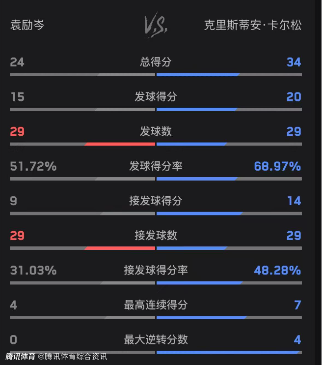 双方技术统计如下(袁励岑在前):总得分24-34、发球得分15-20、发球得分率51.72%-68.97%。